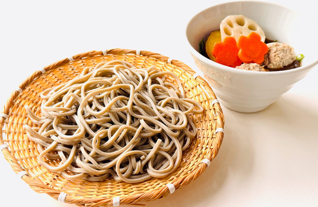 豚つみれと季節野菜をのせたカレーつけ汁で、小松庵特製の太打ち麺をお楽しみください。