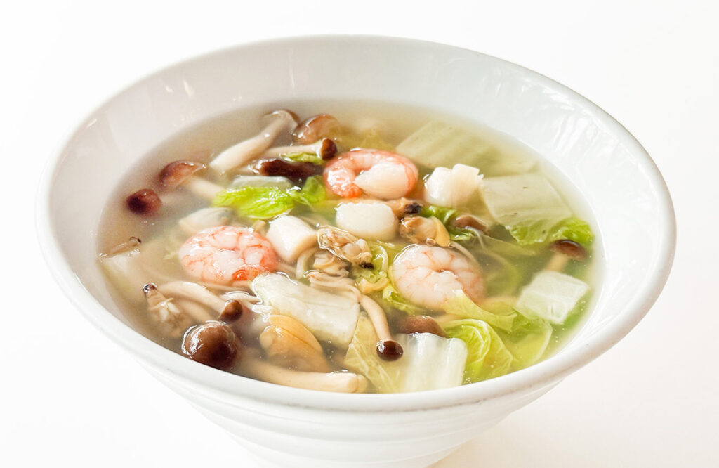 小海老と小柱、あさり、きのこ、銀杏、季節野菜をあさり出汁のあんかけでお召し上がりください。